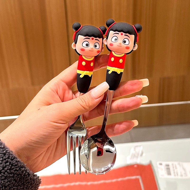 哪吒勺子家用304不銹鋼吃飯勺子可愛卡通魔丸叉勺兒童甜品蛋糕勺