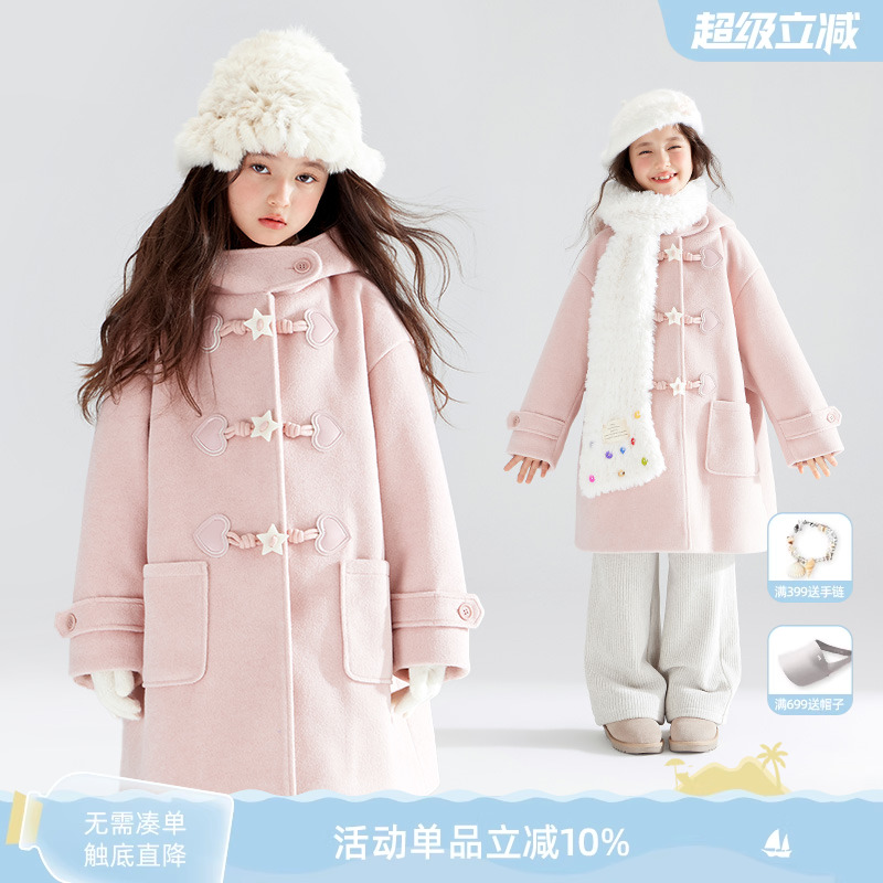 【雪屋追星】蜜桃粉毛呢大衣五角星牛角扣外套加棉冬季女童
