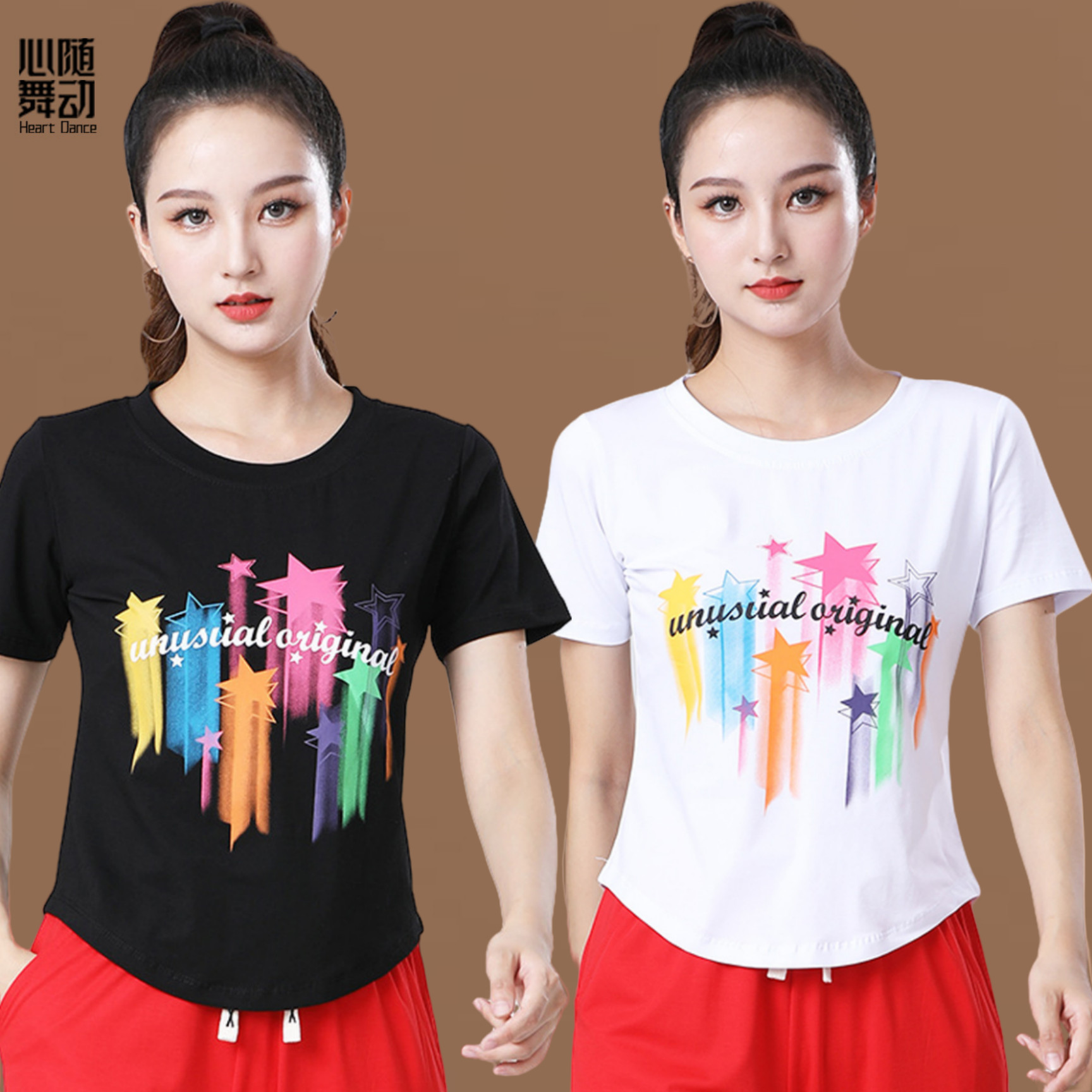 新款女士七彩印花2024夏季新款短袖上衣廣場舞服裝春夏T恤大碼女