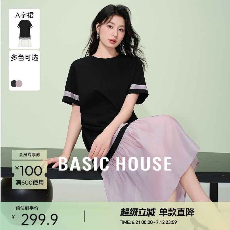 Basic House/百家好韓版撞色簡約T恤裙夏季寬松顯瘦中長款連衣裙