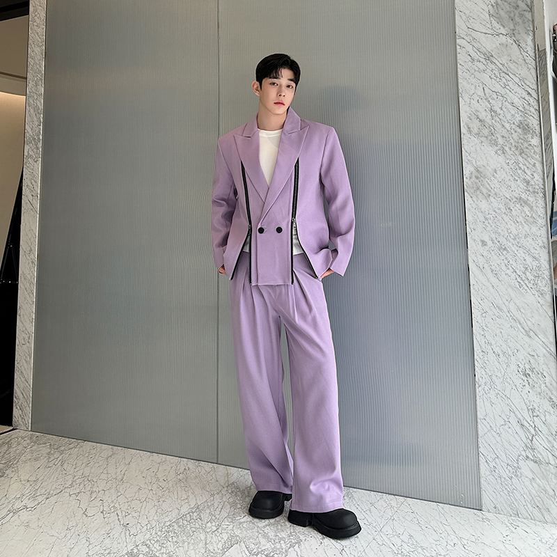 秋裝韓國小眾雙拉鏈解構設計感墊肩西服套裝男拼色腰頭西褲兩件套