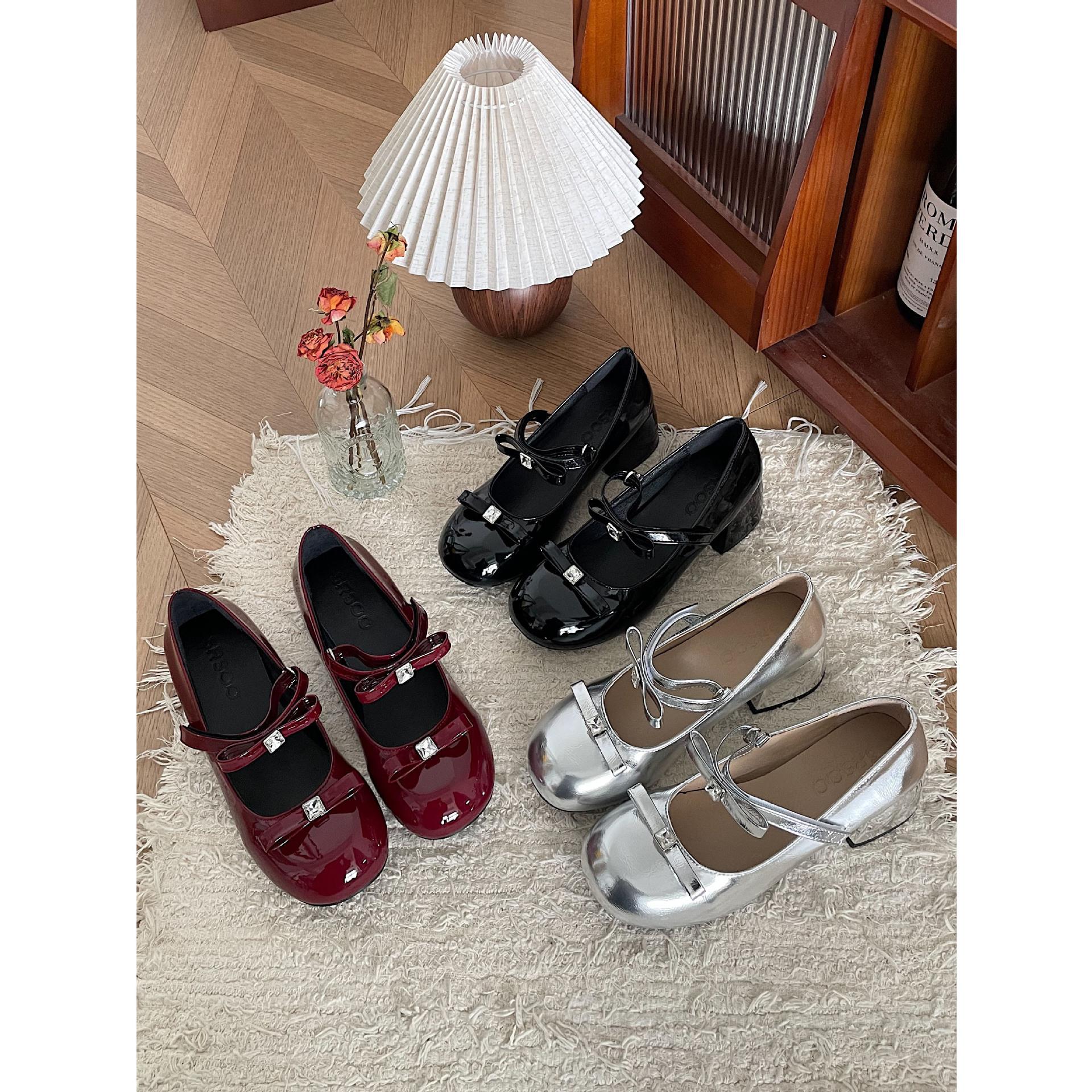 錦覓2025新款法式復古粗跟瑪麗珍鞋一字帶扣蝴蝶結單鞋銀色芭蕾鞋
