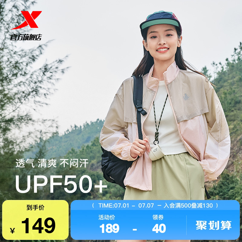 特步防曬外套女士2025夏季新款戶外薄款拼色徒步寬松運動夾克上衣