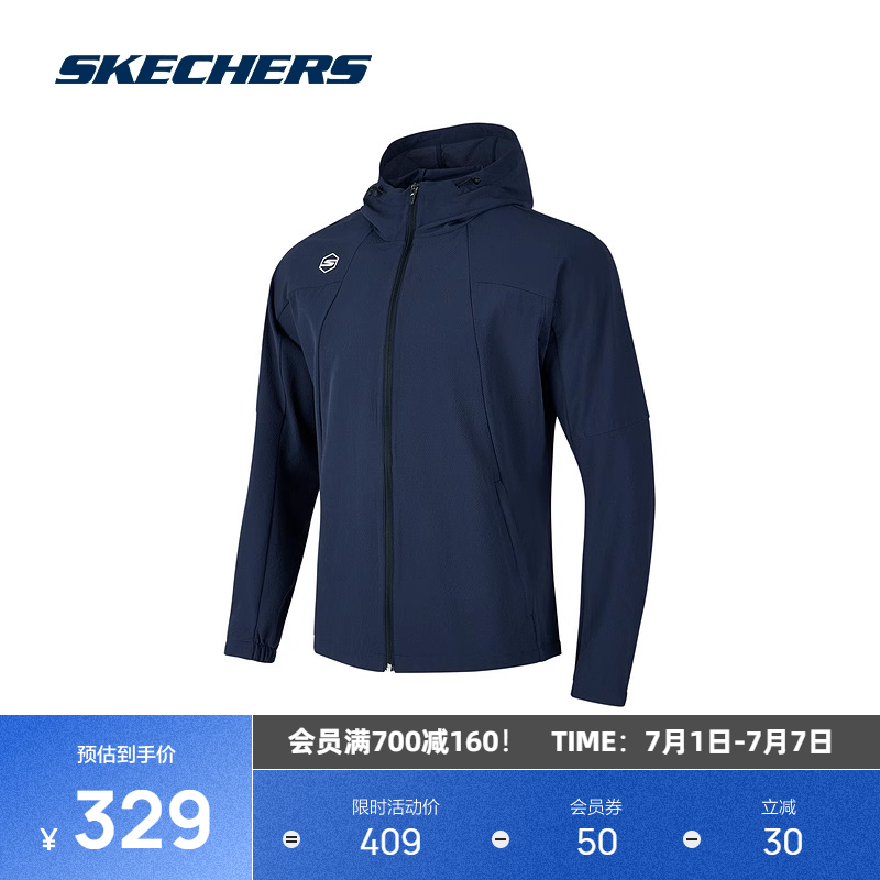 斯凱奇男款梭織連帽外套防紫外線夏季拉鏈連帽設計口袋防曬運動服