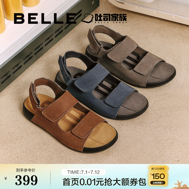 百麗男鞋吐司涼拖鞋魔術貼外穿25夏新牛皮休閑沙灘涼鞋8GG02BL5