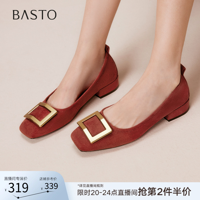百思圖25秋新款舒適一腳蹬紅色單鞋船鞋瓢鞋粗跟淺口女鞋B0016CQ5