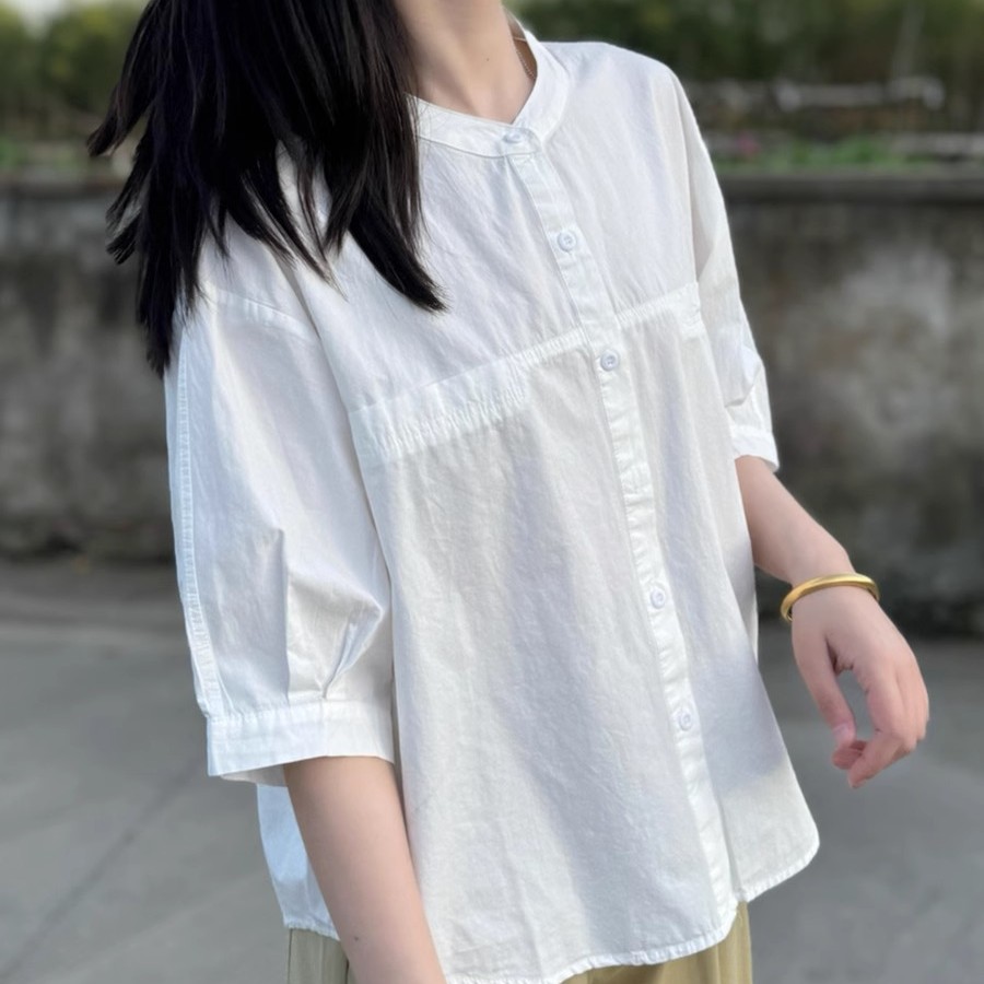 1117純棉日系襯衫女夏新款五分袖圓領寬松百搭設計感短款半袖襯衣