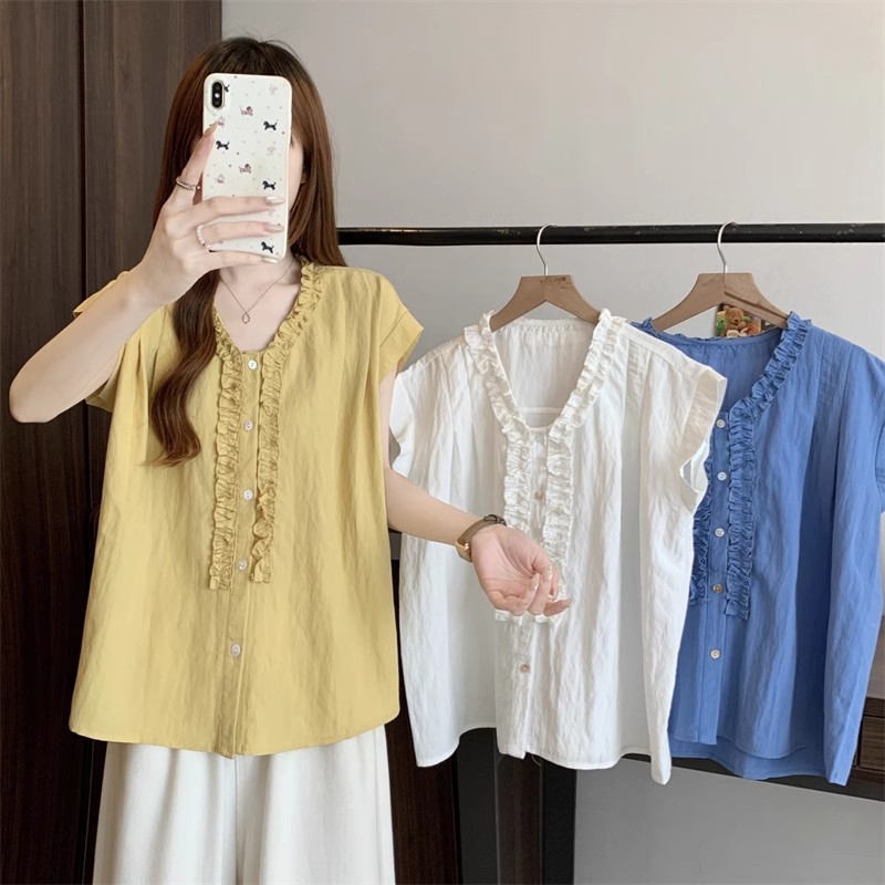 季念微胖妹妹夏新款減齡氣質木耳邊v領寬松閑顯瘦小衫上衣