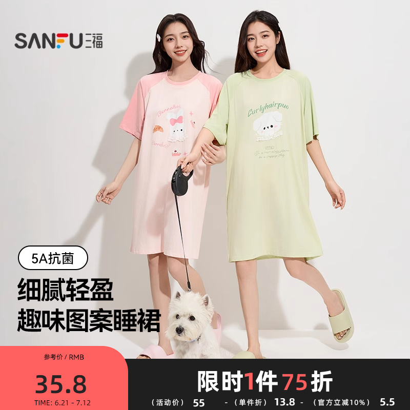 三福睡裙2025夏季新款可愛印花柔軟睡衣寬松抗菌家居服女495670