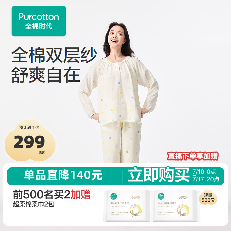 全棉時代女士家居服雙層紗布純棉印花睡衣睡褲夏裝長褲2025年新款
