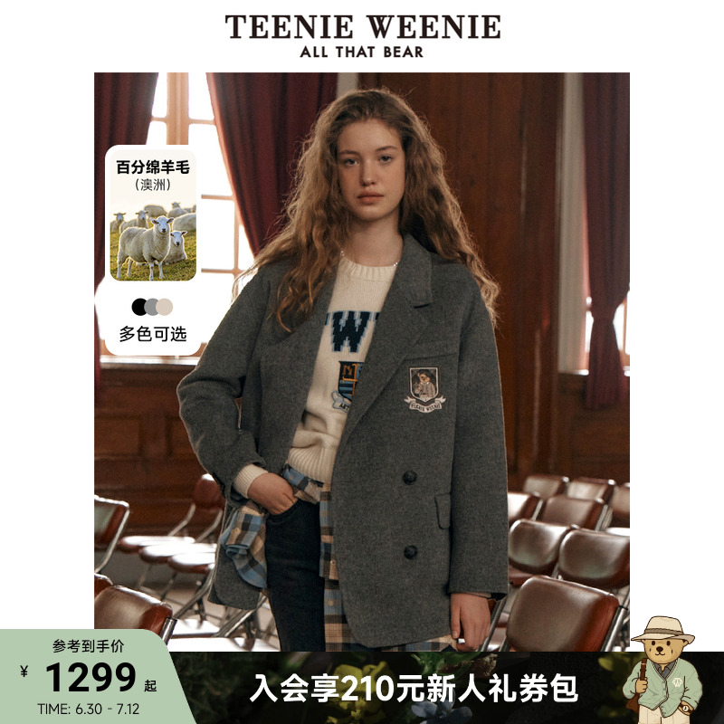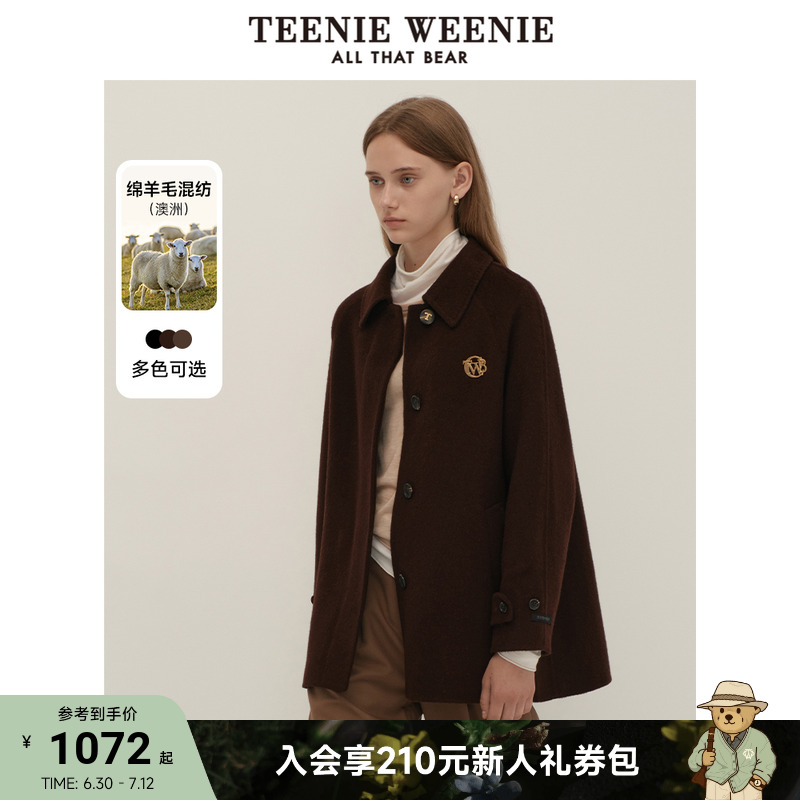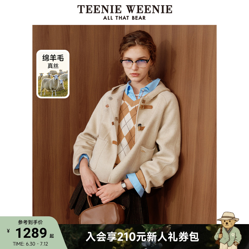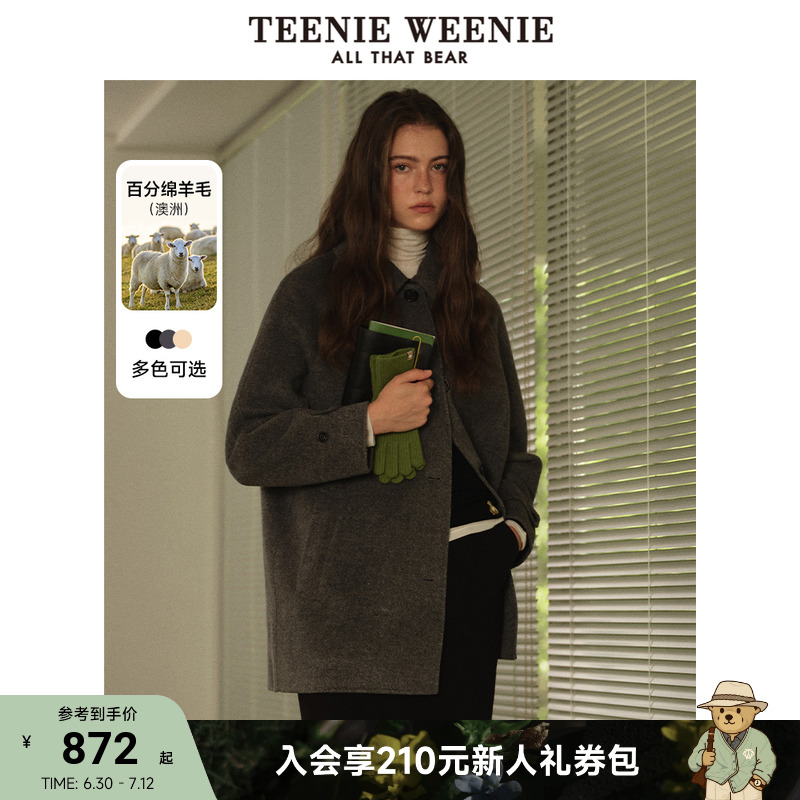 TeenieWeenie小熊女裝短款連帽雙面毛呢大衣綿羊毛混紡基礎款外套
