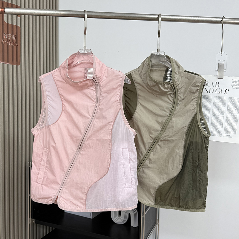 黑科技防曬涼感!山系戶外撞色網格拼接斜拉鏈立領工裝馬甲女夏