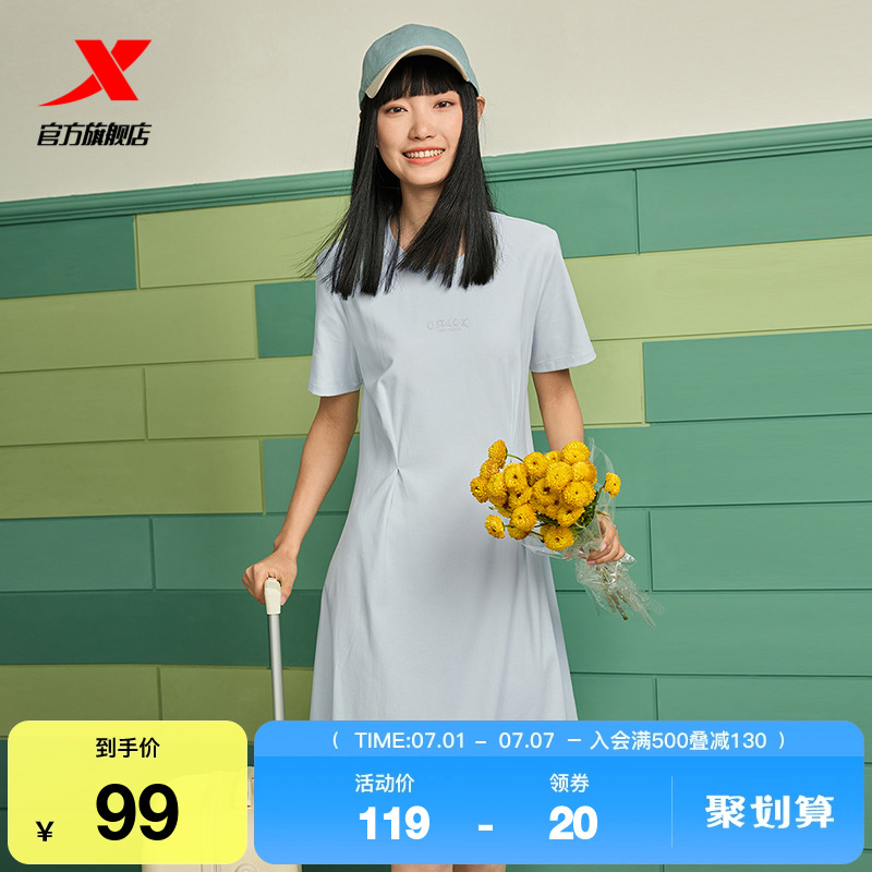 特步連衣裙夏季新款官方正品領翻領純棉條紋休閑百搭顯瘦運動裙子