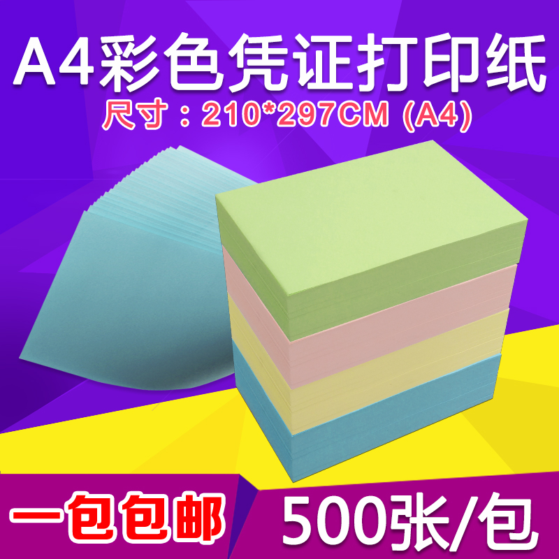 彩色憑證紙A4空白打印紙淺藍綠黃色粉紅80克復印紙記賬憑證500張