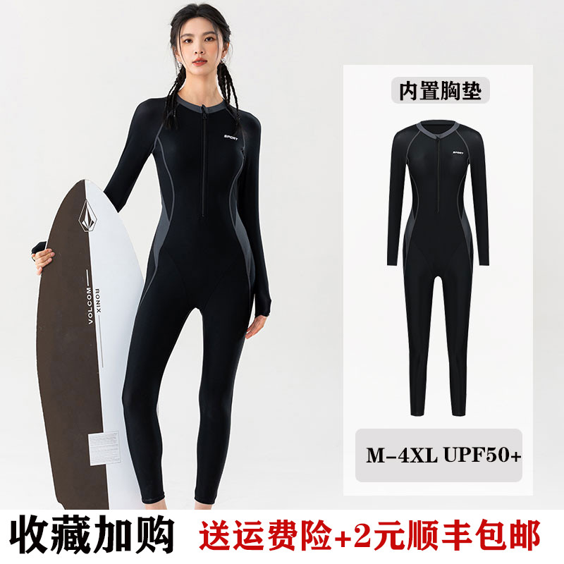 成人女修身顯瘦防曬長袖長褲拉鏈運動連體游泳衣女浮潛沖浪潛水服
