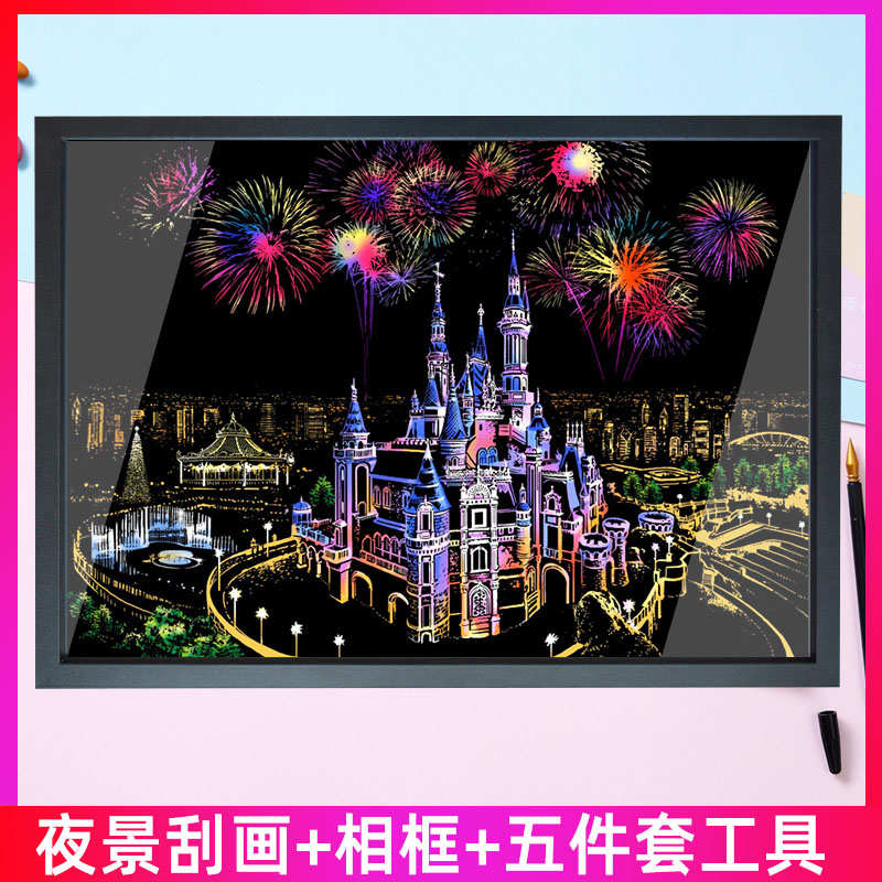 刮刮畫紙相框彩色城市夜景A3八開有圖案手工DIY兒童創意生日禮物