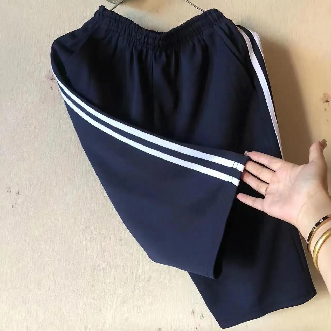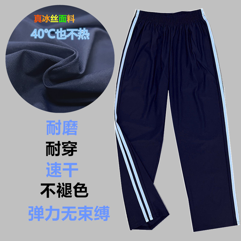 定制夏季冰絲子男女薄款藏青色天藍雙杠高彈力初高中學生運動褲子