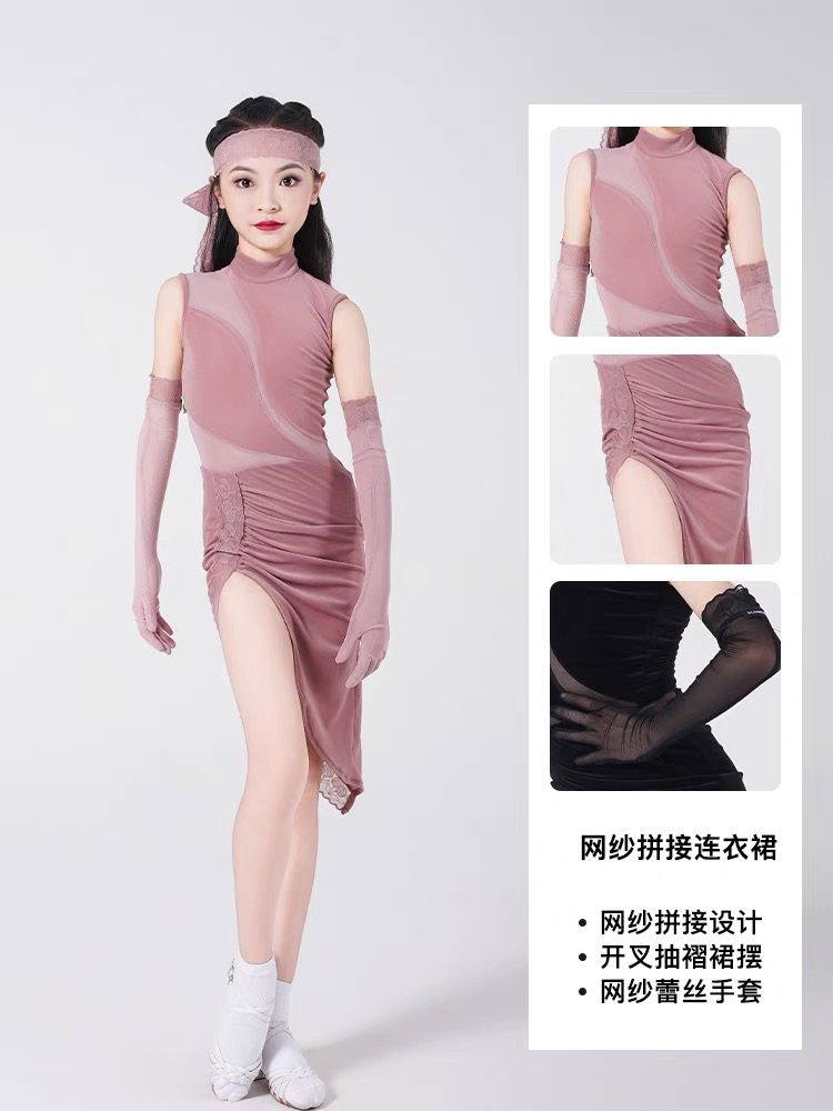 歌瑞亞拉丁舞服女童新款絲絨無袖網紗連體裙兒童拉丁練功表演服