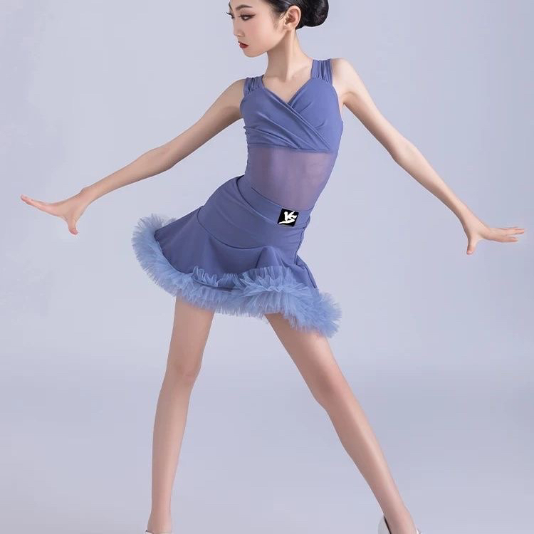 YSX云舒袖|兒童拉丁舞蹈服練功服高級灰色花邊吊帶漏腰花朵裙套裝