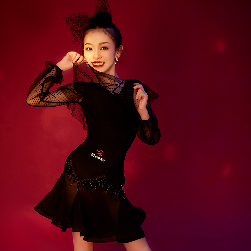 星辰舞服拉丁裙氣質新款網紅同款黑色網紗女兒童成人專業生表演服
