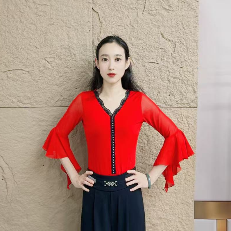 摩登舞歡舞閣吉特巴顯瘦時尚V領女士A0725廣場舞喇叭袖舞蹈服
