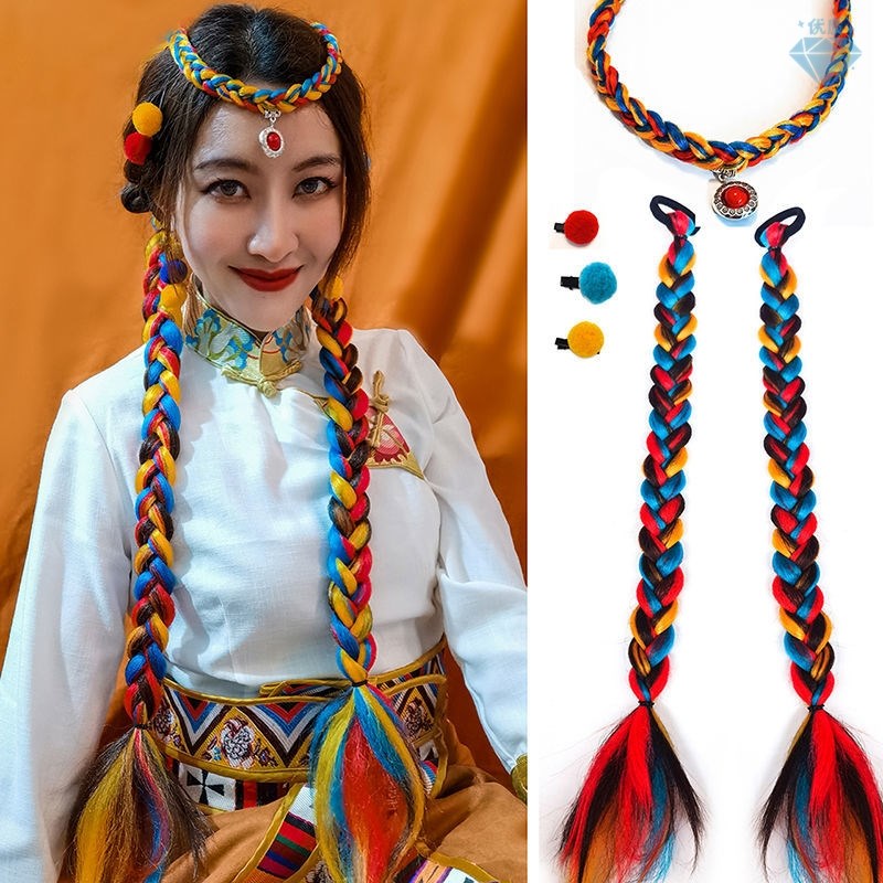 藏族頭飾娜樹藏辮l西藏彩色式假發麻花辮子粗藏服發飾藍紅綠黃色
