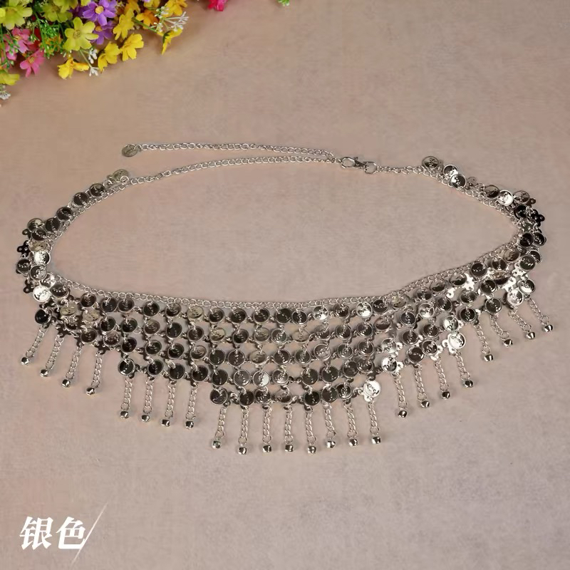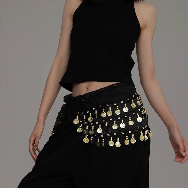 新款皮舞腰鏈半臀巾新款圓三肚角腰埃封亮片金幣銀幣腰鏈