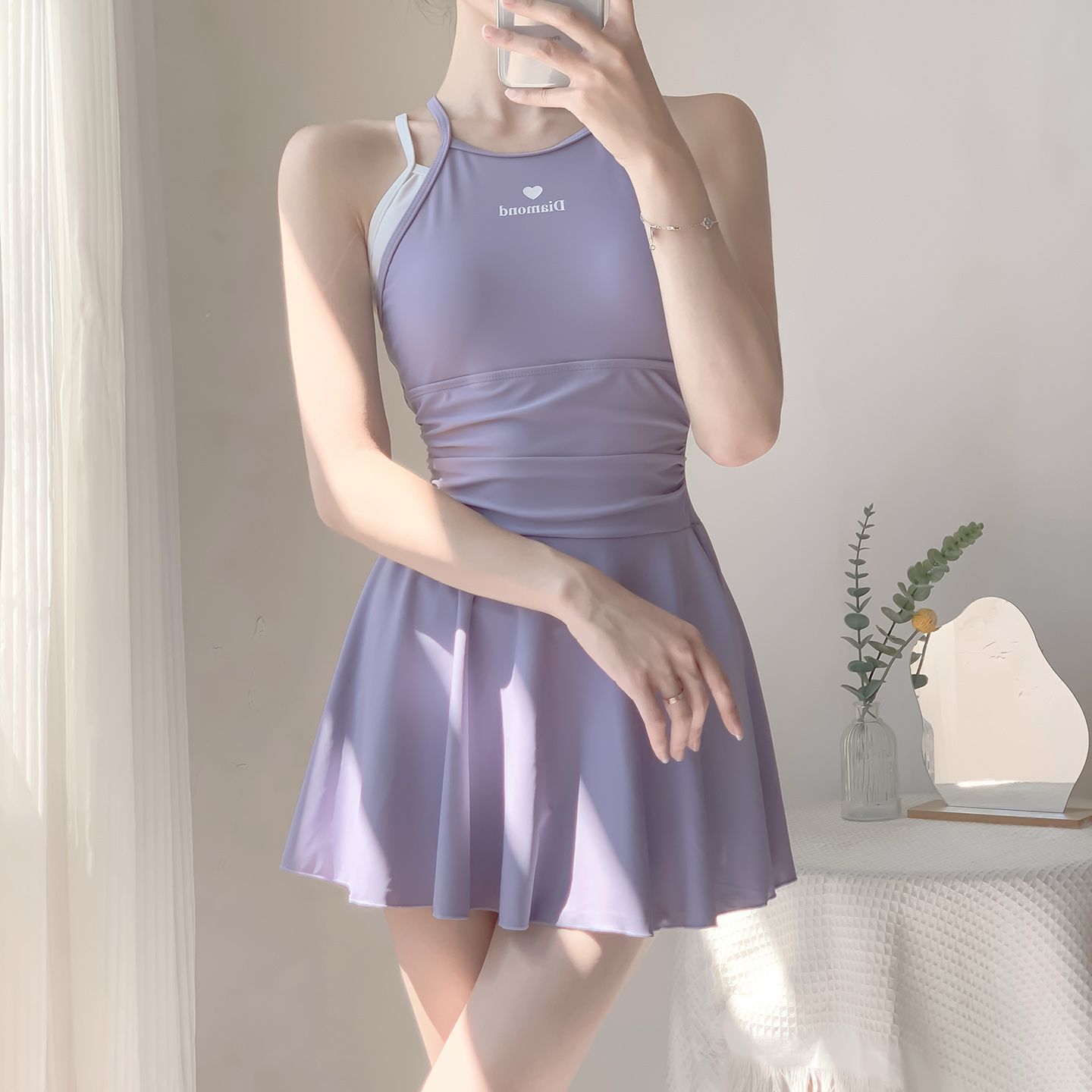 夏語微琪【紫鳶尾】運動風裙式遮肚顯瘦保守連體游泳衣女溫泉度假