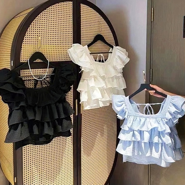 韓版女童2023新款夏季中大童洋木耳邊飛袖方領襯衫兒童氣無袖上衣