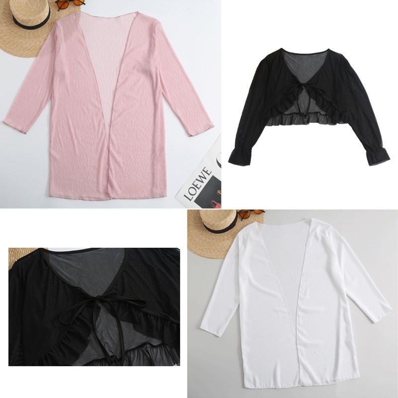 海邊長袖防曬沙灘披紗泳衣外套單件女外面罩衫搭長V款短款大碼速