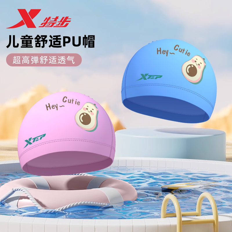 特步兒童泳帽女童男童大頭圍不勒頭防水PU帽可愛專業護耳游泳帽子
