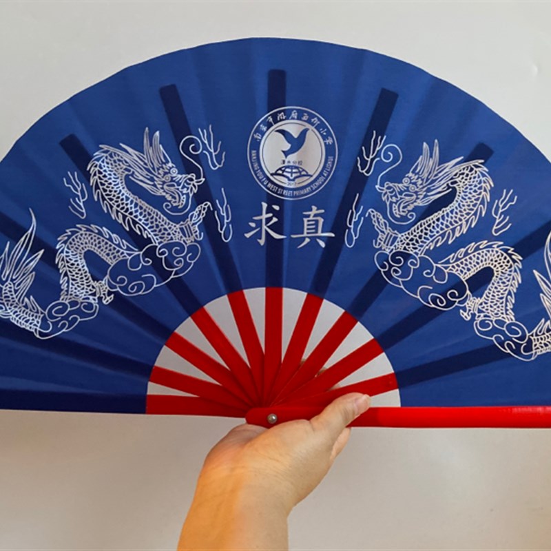 游府西街小學專用扇子求真8寸紅色竹骨藍雙龍功夫扇太Z極扇贈扇袋