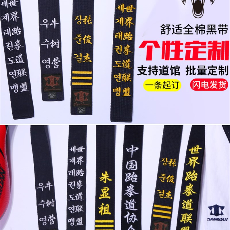 跆拳道腰帶黑帶道帶繡字定制帶子黑色教練帶段位刺繡空手道柔道男