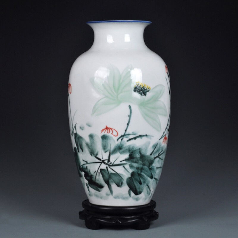 九藏尊品景德鎮陶瓷花瓶擺件客廳插花花器手繪荷花瓷器現代中式裝