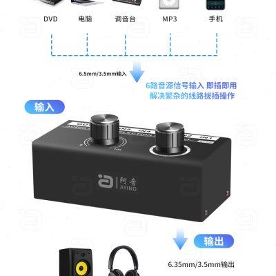 阿音 6路音頻切換器六進一出無損RL立體聲音頻信號轉換器音量調節