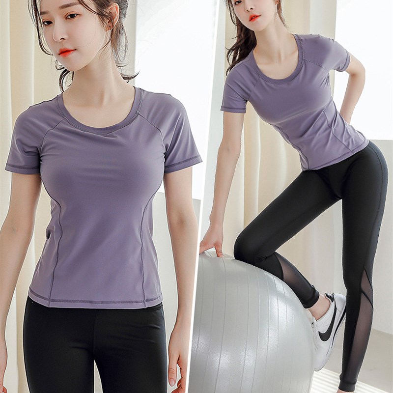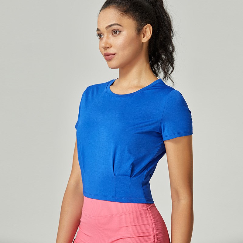 2024b春夏尼龍收腰短款露y臍上衣排汗錦綸圓領套頭短袖T恤女