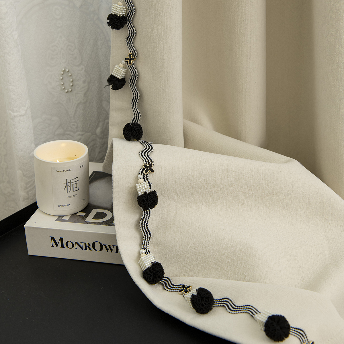 天河花邊新簡約現代黑白窗簾包絲木珠側邊輔料配件牛筋布藝裝飾廠