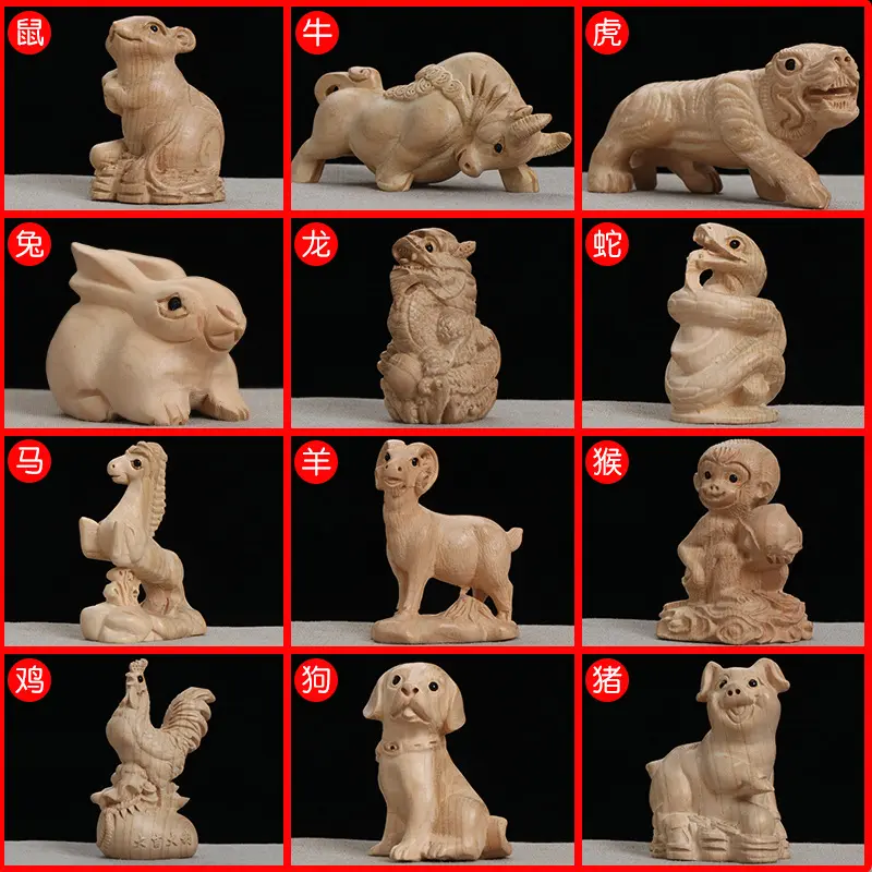 桃木十二生肖木雕擺件手把件鼠?;⑼谬埳唏R羊猴雞狗豬家居工藝品