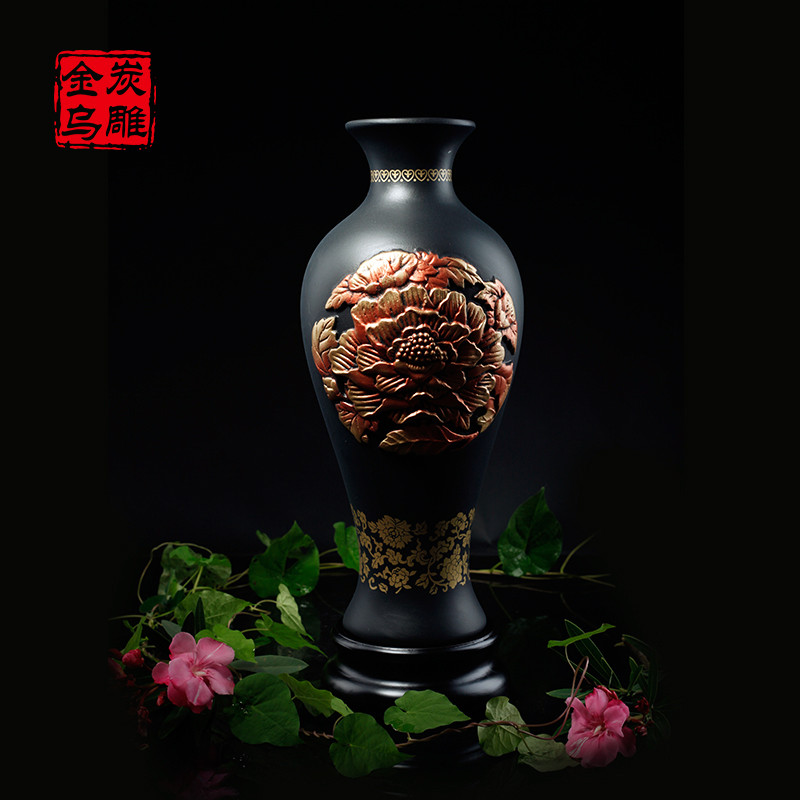 金烏炭雕富貴芙蓉玉堂春花瓶家居裝飾工藝品客廳電視柜炭雕大擺件