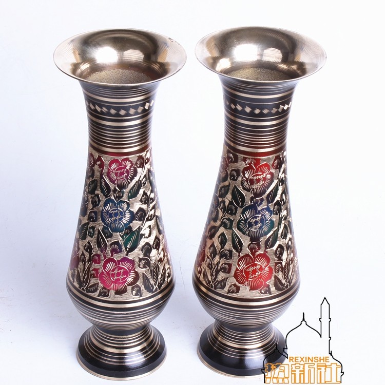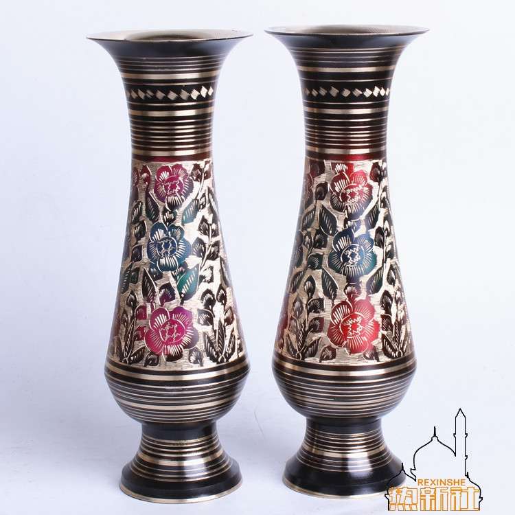 巴基斯坦進口銅器手工雕刻黑漆彩花瓶仿古金屬花瓶擺設插花藝禮品