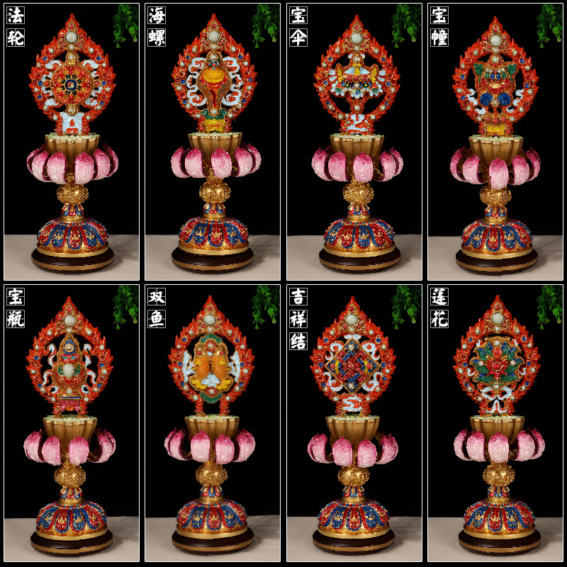 藏傳用品 純銅彩繪密宗精品9寸八寶八吉祥擺件禮佛供具法輪蓮花