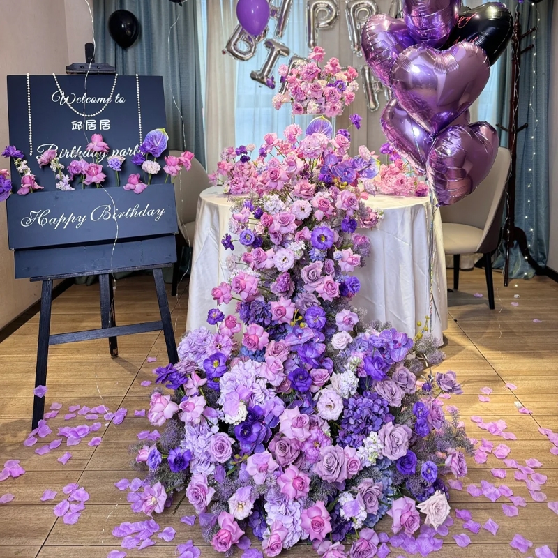 紫色生日布置瀑布桌花布景花藝酒店造景宴會酒店裝飾仿真花瀑布花