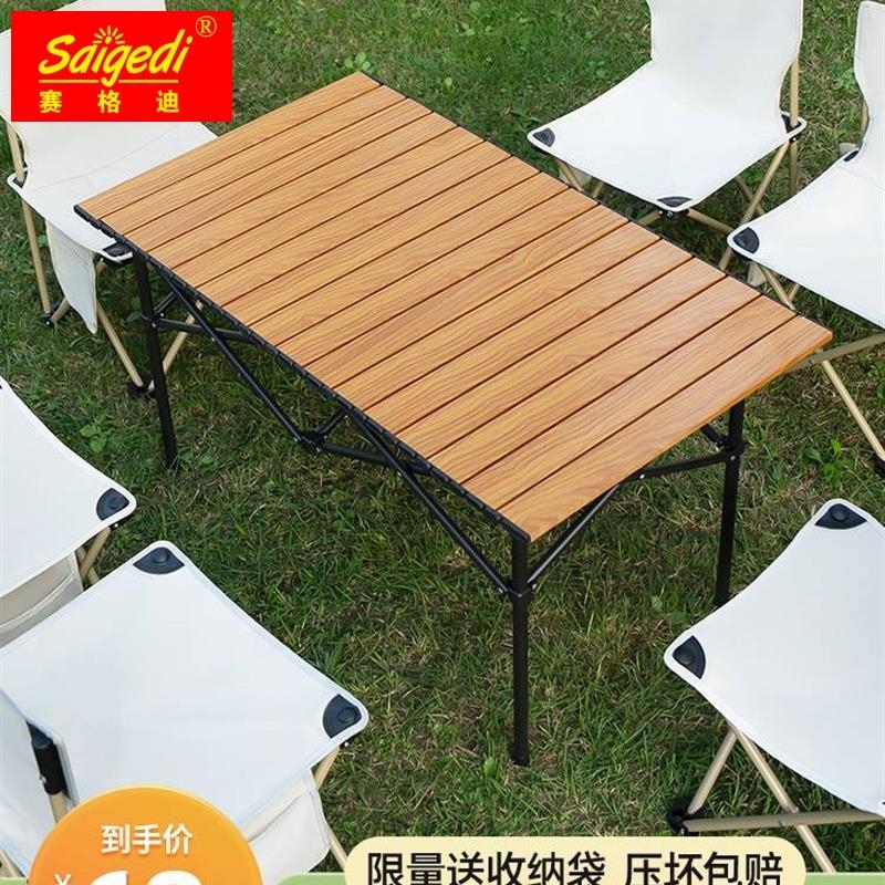 戶外折疊桌子碳鋼合金蛋卷桌便攜式露營桌椅野餐全套裝備用品木紋