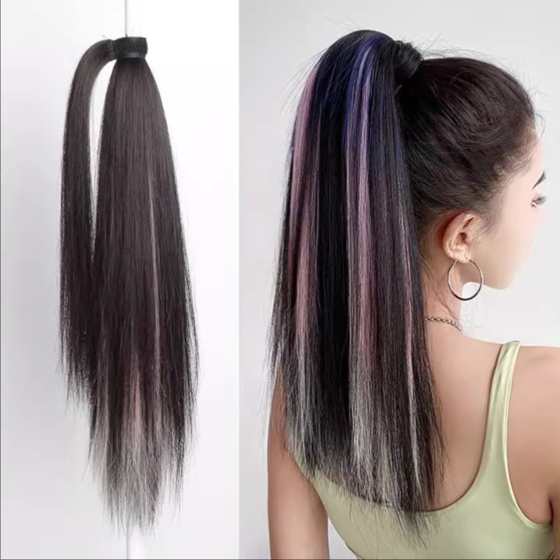 馬尾假發女挑染中長發綁帶式魔術貼自然無痕網紅捆綁式直發辮子