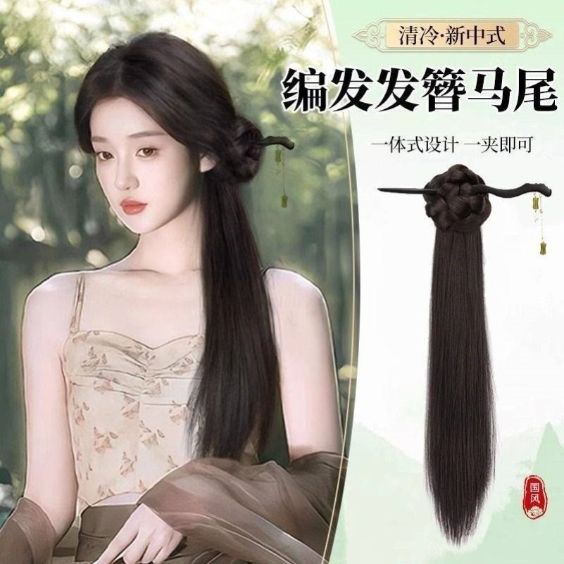 新中式假發辮馬尾女輕國風馬尾假發抓夾古風漢服旗袍編發側馬尾辮