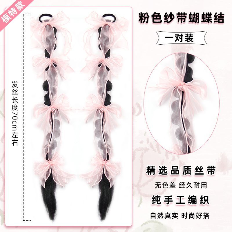 假發辮子女新中式馬尾發圈款自然蝴蝶結雙麻花拳擊假發辮馬尾發飾