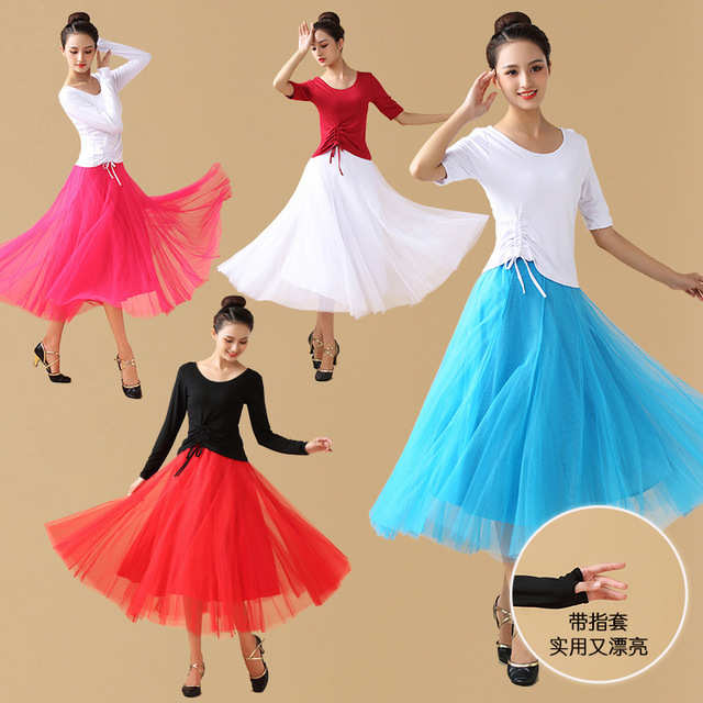 婷姿媄廣場舞服裝新款套裝抽繩莫代爾跳舞上衣網紗長裙表演舞蹈服
