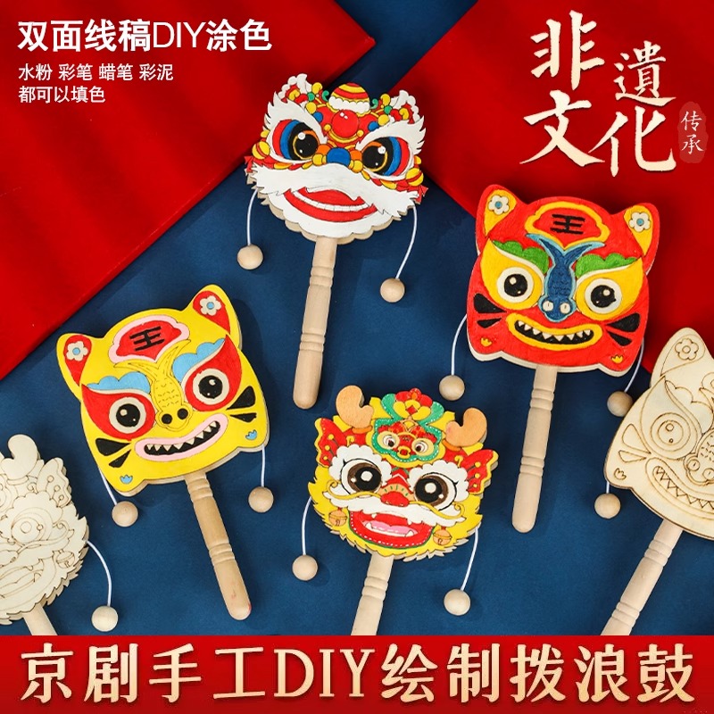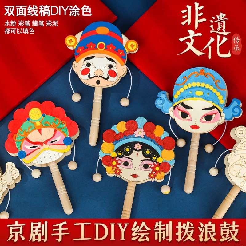 手工diy撥浪鼓材料包非遺制作京劇臉譜玩具幼兒園兒童手繪涂鴉