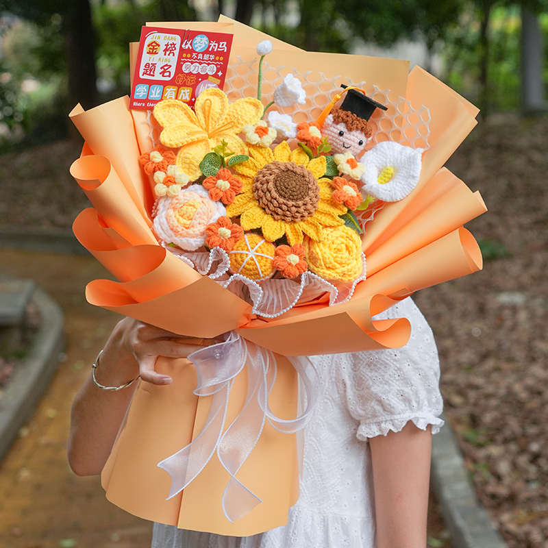 高考大學一舉奪魁畢業禮物鉤織毛線花博士娃娃仿真向日葵花束成品