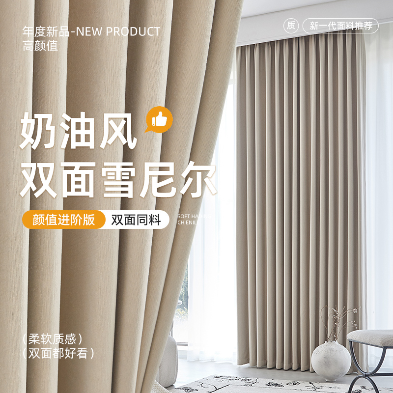 新款臥室窗簾全遮光雪尼爾奶油風陽臺高級感雙面加厚高級感防曬布